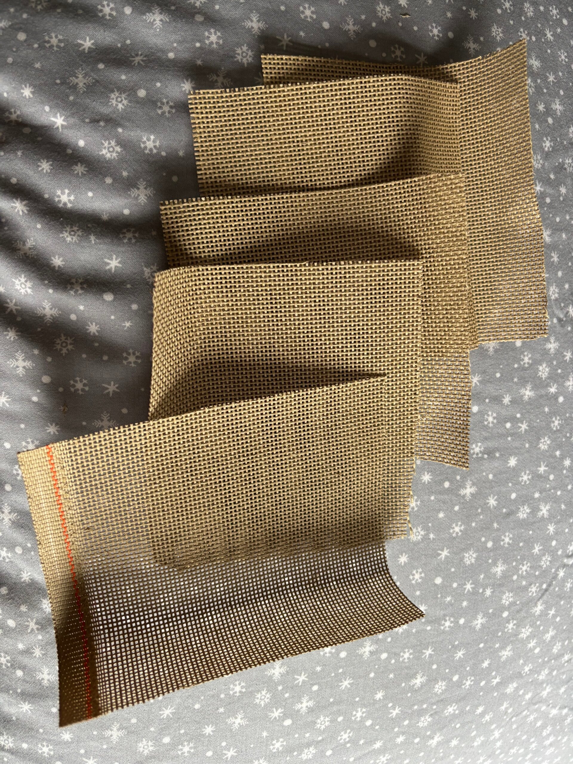 Five 5" x 5" scrap squares of tan monocanvas for needlepoint.